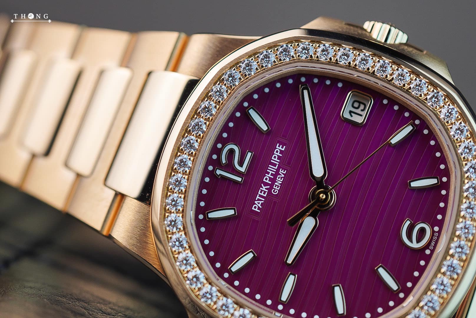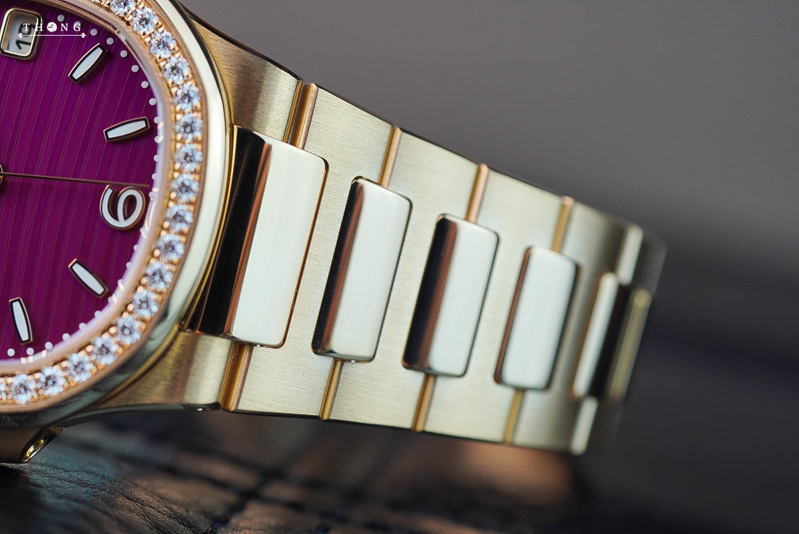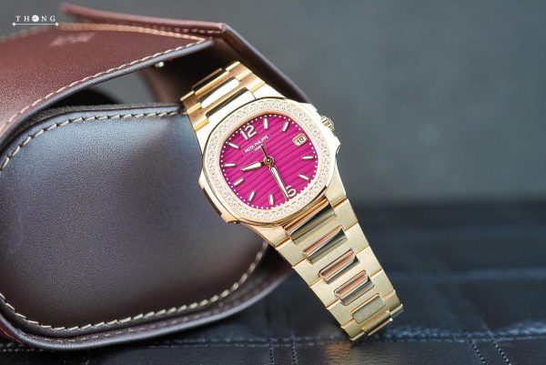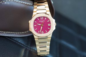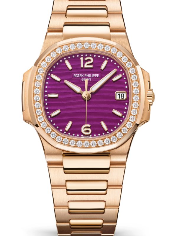 A new version of the ladies’ Nautilus watch featuring a quartz movement and a 32 mm rose gold case with matching bracelet, Reference 7010/1R-013 innovates with the purple shade of its lacquered dial bearing the wave pattern typical of this collection.